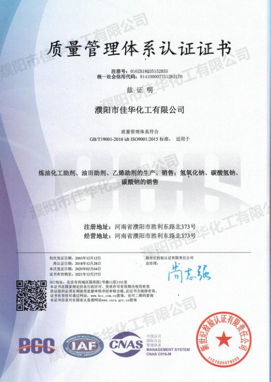 濮陽市佳華化工有限公司始建于1997年,公司注冊資金5300萬元,控股創建河南佳化能源有限公司,注冊資金1億元。目前,公司現有員工162人,其中中高級科研人員38人,占地面積160余畝,2015年實現銷售收入6.86億元,創匯2600萬元,已發展成為集研發、生產、銷售于一體的國家級高新技術企業。   成立19年來,公司積極與中國科學院、中國工程院、中國石化石油化工科學研究院、中國石油大學、華東理工大學等科研院所和高校合作,專業致力于煉油助劑、油品添加劑及高品質油品調合組分的研發與生產, 依托院士工作站研發平臺,瞄準科技前沿,致力于新型、環保煉油助劑和油品添加劑的研發與生產,取……